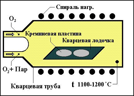 Слой двуокиси кремния формируется обычно на кремниевой пластине за счет химического взаимодействия в приповерхностной области полупроводника атомов кремния и кислорода. Кислород содержится в окислительной среде, с которой контактирует поверхность кремниевой подложки, нагретой в печи до температуры T = 900 - 1200 С. Окислительной средой может быть сухой или влажный кислород. Схематично