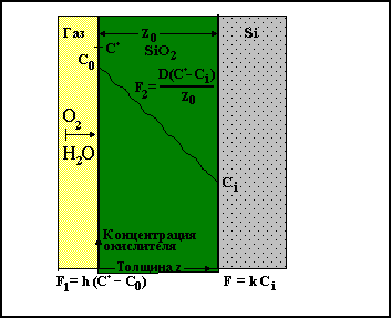 Согласно закону Фика, поток через объем окисла определяется градиентом концентрации окислителя: