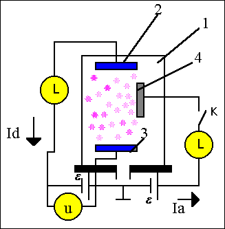 При этом в объеме 1 создается пониженное давление кислорода (обычно 0.1--1 Торр) и между электродами 2 и 3 прикладывается постоянное напряжение разряда Ud величиной внесколько сотен вольт.