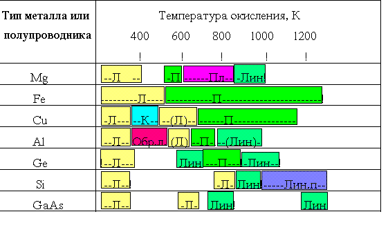 При изучении экспериментальных данных по кинетике процесса термического окисления металлов и полупроводников в зависимости от температуры (см. таблицу 1), можно отметить следующее: