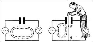 Объясняется это тем, что ток теперь потечет по другому, более короткому пути — через емкость между левой и средней пластинами и далее *по проводу а—б. Путь переменного тока