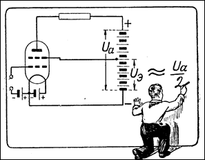 Коэффициент усиления m показывает, во сколько раз напряжение на сетке действует на анодный ток сильнее, чем напряжение на аноде. Если m=10, то это значит, что изменение напряжения на сетке на 1 в действует так же, как изменение на аноде на 106. Подав на анод этой лампы напряжение, например, 1506, мы создадим в ее анодной цепи некоторый ток. Поскольку 1 в на сетке лампы действует также, как 10 в на аноде, то очевидно, что, подав на сетку—15 в, мы совершенно прекратим анодный ток; отталкивающее по отношению к электронам действие сеточного напряжения уравновесит притягивающее действие анода.