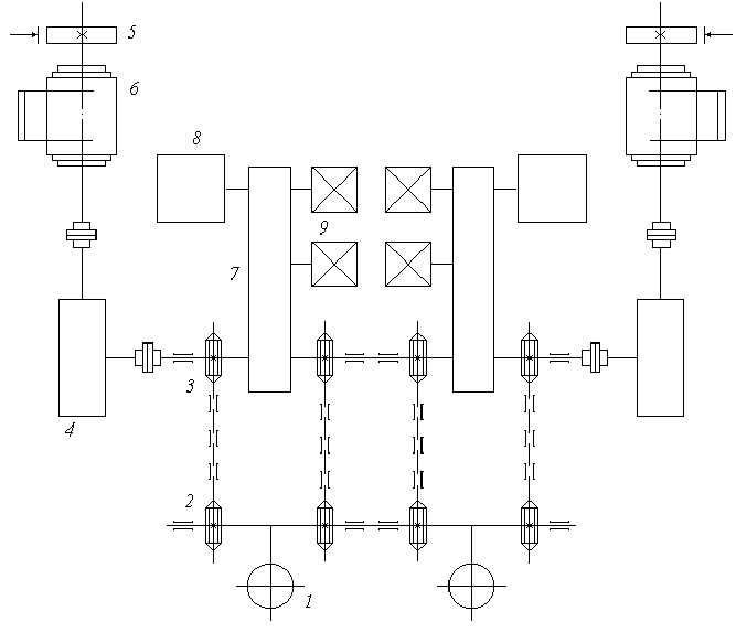 В качестве примера можно привести кинематическую схему приводов фурм конвертера на 250 тонн, по [1], стр. 68, рис. 27.