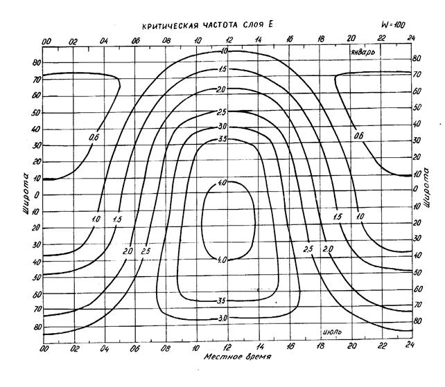 По графику на рис. 2, соответствующему числу солнечных пятен (W=100) и заданному времени года (июль) с учетом заданного временного интервала связи (14.00-16.00) и географической широты точки отражения (59,0°С), определяем значения критических частот слоя Е (индексы поглощения foE). Эти значения также приведены в табл. 1