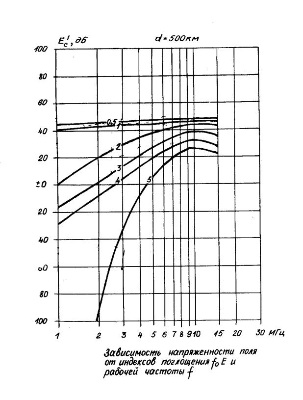 По найденным значениям индексов поглощения foE и ОРЧ из графика на рис.3, соответствующего заданной дальности связи (d=500км), определяем эффективные значения напряженности поля сигнала Е’c[дБ] от передатчика с эффективной мощностью излучения 1 кВт. Далее по формуле (1.1) рассчитываем эффективные значения напряженности поля сигналов Ес от передатчика с заданной мощностью. При этом значения коэффициента