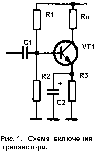 В качестве схемы усилителя выберем стандартную схему включения транзистора с общим эмиттером (рис. 1) . Разделительный конденсатор С1 служит для передачи на вход транзистора VT1 усиливаемого переменного напряжения, а также исключает попадание на вход транзистора постоянного напряжения. Резисторы R1 и R2 образуют делитель для получения необходимого напряжения смещения на базе транзистора. Резистор R1 и конденсатор C2 обеспечивают температурную стабилизацию работы усилителя. В данной схеме резистор RН является нагрузкой.