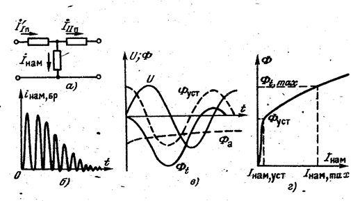 При включении трансформатора под напряжение действующее значение броска тока намагничивания Iбр.нам в первый период равно (6—8)Iт,ном . где Iт,ном — номинальный ток трансформатора.