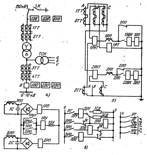 На рис. 7 представлена схема защиты трансформатора отпаечной подстанции. Оба контакта газовой защиты (как сигнальный, так и отключающий) питаются от трансформатора собственных нужд ТСН (рис. 7, а). Это допустимо, поскольку имеется дифференциальная защита, которая, являясь основной, резервирует действие газовой защиты в случае отказа последней при повреждениях трансформатора, сопровождающихся значительным снижением напряжения на шинах собственных нужд. Резистор 2СД (рис. 7, в), подключенный параллельно обмотке реле; ЗРП (типа РП-26), "увеличивает ток в обмотке указательного реле 2РУ (типа РУ-21) для обеспечения более четкой его работы. Реле ЗРП, сработав, самоудерживается через размыкающий .вспомогательный контакт короткозамыкателя 1К.. Резистор 1СД необходим для работы 2РУ при переводе действия газовой защиты отключающим устройством 2ОУ на сигнал.
