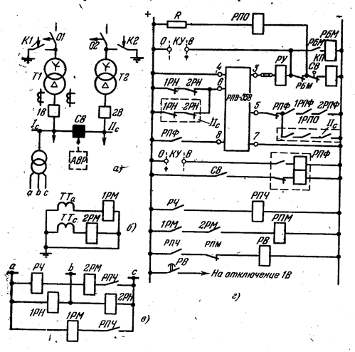 Устройство состоит из реле частоты РЧ (рис. 8, в), промежуточных реле РПЧ и РПМ, реле направления мощности 1РМ, 2РМ (рис. 8,б) и реле времени РВ.