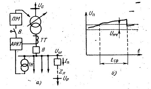 Рис. 9. Поясняющая схема (а) и характеристика изменения напряжения у потребителя при наличии АРКТ (б).