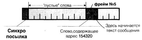Для передачи адреса пейджера применяется следующее правило. Все пространство адресов делится на 8 групп, нумеруемых от 0 до 7. Фреймы внутри блока также нумеруются oт 0 до 7. Адрес пейджера делится на 8. Остаток от деления дает номер фрейма, в котором пейджер будет искать свой адрес. В этом фрейме либо в первом, либо во втором слове передается результат деления. Bce предыдущие фреймы этого блока заполняются специальными 32-х битными последовательностями-"пустыми" словами (01111010100010011100000110010111). Сразу же после передачи адреса начинается передача собственно сообщения.