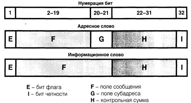 Для передачи адреса пейджера и текста сообщения используются адресные и информационные кодовые слова соответственно. Формат этих слов показан на следующем рисунке: