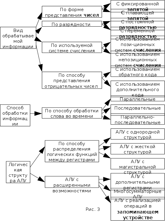 остальные регистры программно-недоступные, так как они не могут быть адресованы в программе . Операционные устройства можно классифицировать по виду обрабатываемой информации, по способу обработки информации и логической структуре. Подробная классификация АЛУ показана на рис. 3.