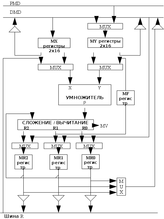 Результат работы сумматора загружается либо в регистр обратной связи МF, либо в регистр результата MR. Регистр обратной связи MF позволяет использовать биты 16-31 результата непосредственно, как операнд Y в следующем цикле. Регистр результата (MR) шириной 40 бит состоит из трех регистров: MR0,MR1 и MR2. Каждый из этих регистров может быть напрямую загружен через шину DMD и записан через шину DMD или на шину промежуточных результатов R.