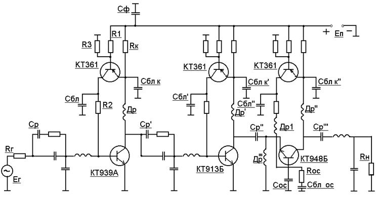При проектировании любого усилителя основной трудностью является обеспечение заданного усиления в рабочей полосе частот. В данном случае полоса частот составляет 20-500 МГц. С учётом того, что усилительные свойства транзисторов значительно ухудшаются с ростом частоты, то разработка устройства с подъёмом АЧХ на таких частотах является непростой задачей. Наиболее эффективным представляется использование в данном случае межкаскадных корректирующих цепей 3-го порядка. Такая цепь позволит оптимальным, для нашего случая, образом получить нужный коэффициент усиления с нелинейными искажениями, не выходящими за рамки данных в задании.