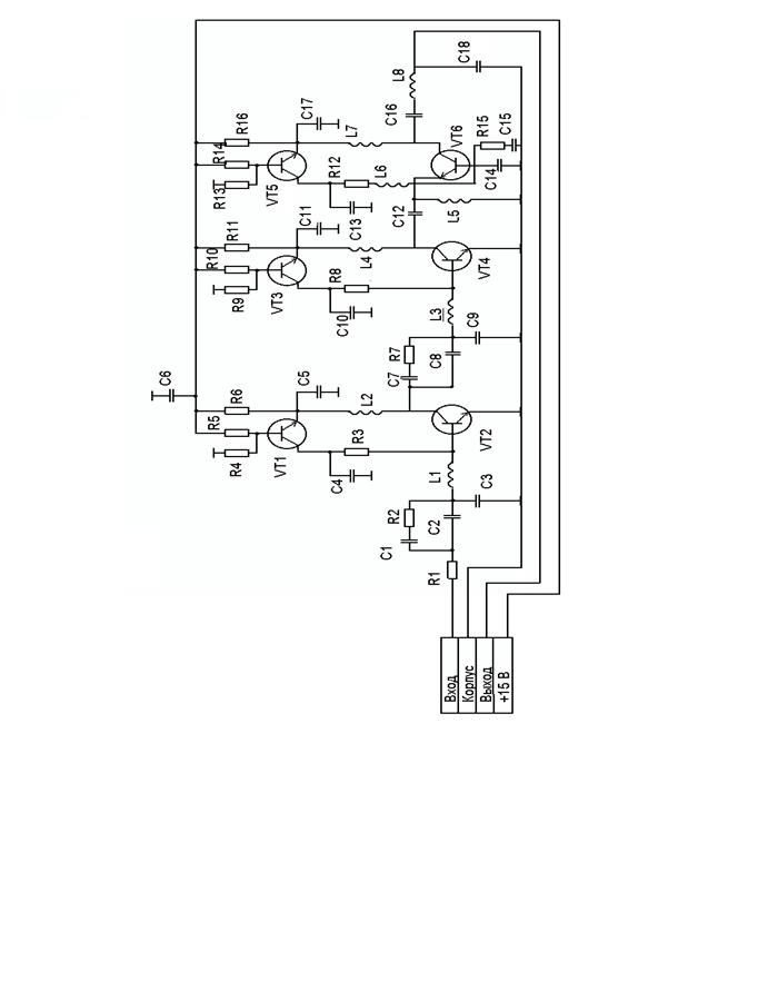 Зная, что каскад с общим эмиттером позволяет получать усиление около 7 дБ, оптимальное число каскадов данного усилителя равно трём. Предварительно распределим на каждый каскад по 6 дБ. Таким образом, коэффициент усиления устройства составит 18 дБ, из которых 15 дБ требуемые по заданию, а 3 дБ будут являться запасом усиления.
