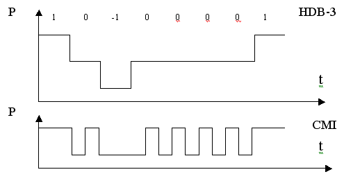 В современных оптоволоконных системах связи для городской телефонной сети ИКМ-120-4/5 и ИКМ-480-5 для передачи в качестве линейного кода используется код CMI, отвечающий большинству вышеперечисленных требований. Особенностью данного кода является сочетание простоты кодирования и возможности выделения тактовой частоты заданной фазы с помощью узкополосного фильтра. Код строится на основе кода HDB-3 (принцип построения представлен на рис.1.4). Здесь символ +1 преобразуется в