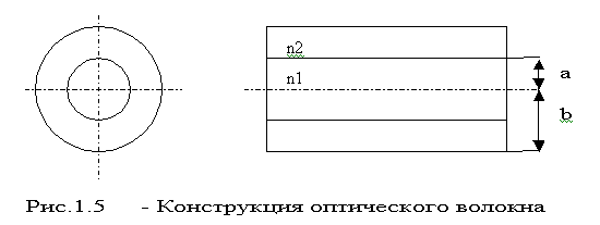 Оптический кабель (ОК) предназначен для передачи информации, содержащейся в модулированных электромагнитных колебаниях оптического диапазона. В настоящее время используется диапазон длин волн от 0.8 до 1.6 мкм, соответствующий ближним инфракрасным волнам. В будущем возможно расширение рабочего диапазона в область дальних инфракрасных волн с длинами волн от 5 до 10 мкм. Оптический кабель содержит один или несколько световодов. Световод – это направляющая система для электромагнитных волн оптического диапазона. Практическое значение имеют только волоконные световоды, изготовленные из высоко прозрачного диэлектрика: стекла или полимера. Для концентрации поля волны вблизи оси световода используется явление преломления и полного отражения в волокне с показателем преломления, уменьшающимся от оси к периферии плавно либо скачками. Световод состоит из оптического волокна и покрытия. Оптическое волокно (ОВ) из стекла изготавливается обычно с внешним диаметром 100 – 150 мкм. Конструкция ОВ показана на рис.1.5. Оптическое волокно состоит из сердечника с показателем преломления n1 и оболочки с показателем преломления n2, причем n1>n2. Спецификой ОВ является их высокая чувствительность к внешним механическим воздействиям. Кварцевое оптическое имеет малый температурный коэффициент расширения, высокий модуль упругости и низкий предел упругого растяжения; при относительном удлинении 0.5 – 1.5% оно ломается. Обрыв волокна происходит в сечении, наиболее ослабленном микротрещинами, возникающими на его поверхности. Микротрещины развиваются при попадании на поверхность влаги, поэтому прочность непокрытого волокна быстро уменьшается, особенно во влажной атмосфере. Механические характеристики оптического волокна, поступающего на кабельное производство, столь же важны и подлежат такой же тщательной проверке, как и оптические его параметры.