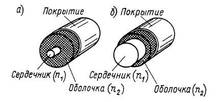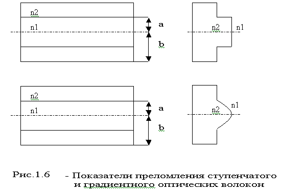 Различают световоды со ступенчатым профилем, у которых показатель преломления сердцевины n1 одинаков по всему поперечному сечению, и градиентные - с плавным профилем, у которых n1 уменьшается от центра к периферии (рис.1.6).