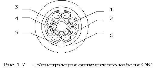 На сегодняшний день для городской телефонной сети отечественной промышленностью выпускаются кабели марки ОК имеющие четыре и восемь волокон. Конструкция ОК-8 приведена на рис.1. 7. Оптические волокна 1 (многомодовые, ступенчатые) свободно располагаются в полимерных трубках 2. Скрутка оптических волокон – повивная, концентрическая. В центре – силовой элемент 3 из высокопрочных полимерных нитей в пластмассовой трубке 4. Снаружи – полиэтиленовая лента 5 и оболочка 6. Кабель ОК-4 имеет принципиально те же конструкцию и размеры, но четыре ОВ в нем заменены пластмассовыми стержнями.
