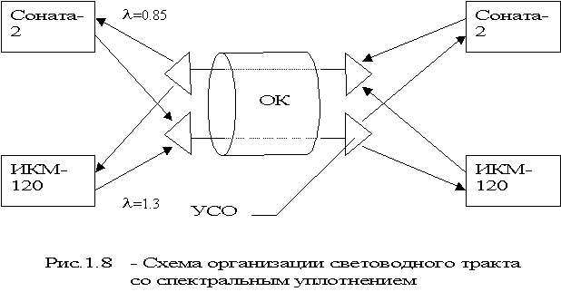 Они представляют собой пассивные оптические устройства, обеспечивающие с помощью интерференционного светофильтра объединение в одном ОВ и разделение сигналов с несущими на волнах 0.85 и 1.3 мкм. Схема организации световодного тракта со спектральным уплотнением показана на рис.1.8.