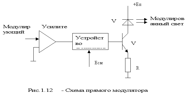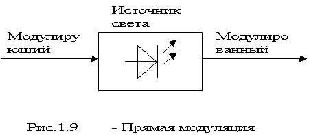 1) Прямая модуляция. При этом модулирующий сигнал управляет интенсивностью (мощностью) оптической несущей. В результате мощность излучения изменяется по закону изменения модулирующего сигнала (рис.1.9).