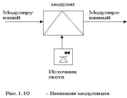 2) Внешняя модуляция. В этом случае для изменения параметров несущей используют модуляторы, выполненные из материалов, показатель преломления которых зависит от воздействия либо электрического, либо магнитного, либо акустического полей. Изменяя исходными сигналами параметры этих полей, можно модулировать параметры оптической несущей (рис.1.10).