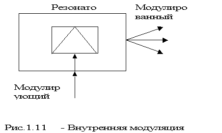 3) Внутренняя модуляция. В этом случае исходный сигнал управляет параметрами модулятора, введённого в резонатор лазера (рис.1.11).