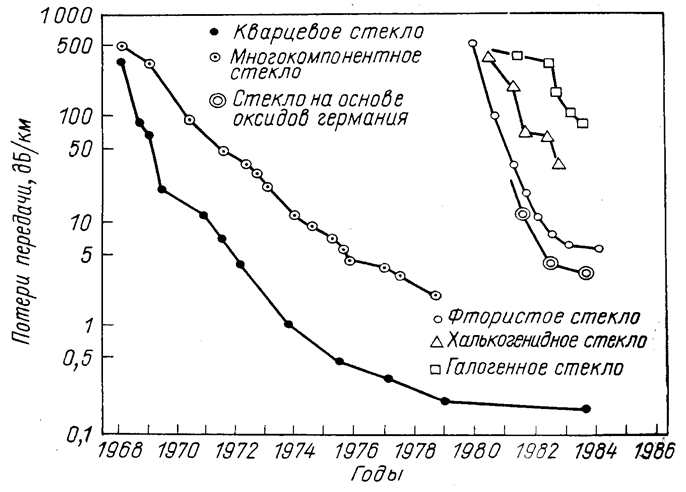 Оптические волокна имеют очень малое (по сравнению с другими средами) затухание светового сигнала в волокне. Лучшие образцы российского волокна имеют затухание 0.22 дБ/км на длине волны 1.55 мкм, что позволяет строить линии связи длиной до 100 км без регенерации сигналов. Для сравнения, лучшее волокно Sumitomo на длине волны 1.55 мкм имеет затухание 0.154 дБ/км. В оптических лабораториях США разрабатываются еще более "прозрачные", так называемые фтороцирконатные волокна с теоретическим пределом порядка 0,02 дБ/км на длине волны 2.5 мкм. Лабораторные исследования показали, что на основе таких волокон могут быть созданы линии связи с регенерационными участками через 4600 км при скорости передачи порядка 1 Гбит/с.