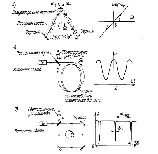 На рис. 3.3 приведены общие схемы систем, разработанных для повышения точности измерений. Кольцевой лазерный гироскоп (рис. 3.3, а) отличается высокой частотой световой волны — до нескольких сотен терагерц. Волоконно-оптический гироскоп на (рис. 3.3, б) имеет высокую чувствительность, благодаря использованию длинного одномодового оптического волокна с низкими потерями. В оптическом гироскопе пассивного типа с кольцевым резонатором (рис. 3.3, в) используется острая резонансная характеристика резонатора.