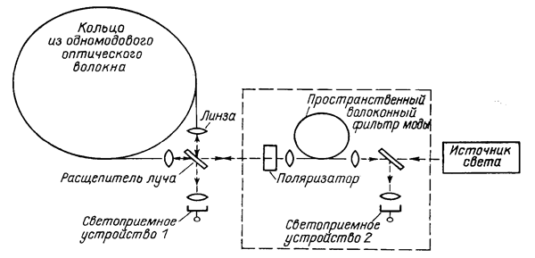 В основной оптической системе, показанной на рис. 4, при использовании светоприемника 1 свет дважды отражается расщепителем луча и, кроме того, дважды проходит сквозь него. При этом условие одинаковой длины оптического пути выполняется не совсем точно и вследствие температурных колебаний характеристик расщепителя луча на выходе возникает дрейф. При использовании светоприемника 2 происходит то же самое. Чтобы световые лучи, введенные в оптическое волокно и излучаемые волокном, проходили одинаковый оптический путь, объединялись и разъединялись в одной и той же точке расщепителя луча, а также имели бы одинаковую моду, необходимо между расщепителями луча установить пространственный фильтр. В этом фильтре желательно использовать одномодовое оптическое волокно — то же, что и для чувствительной катушки.