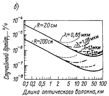 Результаты расчета при типичных значениях параметров приведены на рис. 3.5, а. Для оптического волокна с потерями 2 дБ/км пределы обнаружения примерно 10-8 рад/с (0,001°/ч). Это как раз значения, применяемые в инерциальной навигации. На рис. 3.5, б показано, что благодаря увеличению радиуса катушки с оптическим волокном, а также использованию света с длиной волны 1,55 мкм, на которой потери в оптическом волокне очень низки, возможно создание измерителя оборотов в инерциальном пространстве с чрезвычайно малым дрейфом. Это позволяет применять измеритель не только в навигации, но и в геофизике.