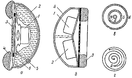 тродинамического типа. Описание принципа действия этого типа телефонов приводится ниже; в качестве примера приведем конструкцию телефона ТДС-1 (рис. 1, а). В корпусе находится малый электродинамический громкоговоритель с диффузором или полусферической диафрагмой. Пространство между ним и корпусом заполнено звукопоглощающим материалом (поролон). Перед громкоговорителем находится перферированная решетка.