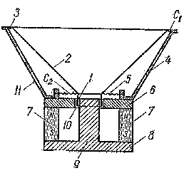 1 - звуковая катушка; 2 - диффузор; 3 - подвес диффузора; 4 - корпус; 5 - шайба; 6, 8 - фланцы; 7 - магнит; 9 - керн; 10 - кольцевой зазор; 11 - отверстия для выхода тыльного излучения.