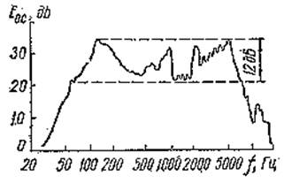 Одновременно с этим уменьшают плотность материала, например делают его пористым (без сквозных пор). Применяется различная пропитка материала диффузора, поэтому в диапазоне частот, в котором диффузор колеблется как мембрана, частотная характеристика получается очень изрезанной (рис. 3). Но так как слух человека из-за достаточно широких критических полосок слуха сглаживает частотную характеристику, то не все пики и провалы заметны на слух. Частотная зависимость осевой чувствительности громкоговорителя (отношение звукового давления на оси к подводимому напряжению) без учета резких пиков и провалов близка и равномерной до частот примерно 6...7 кГц (см. рис. 3). Это объясняется тем, что с увеличением частоты перестает колебаться внешняя, часть диффузора. Выше 7...8 кГц частотная характеристика круто падает. Все это относится к несоставным громкоговорителям, рассчитанным для работы в широком диапазоне частот.