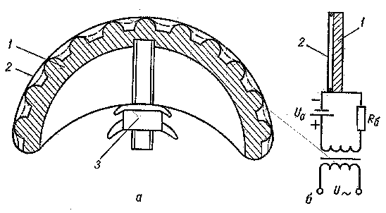 а - конструкция (1 - массивный электрод; 2 - гибкий электрод с изоляцией; 3 - натягивающий винт); б - схема включению.