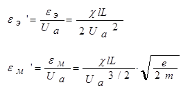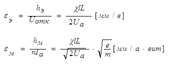 Параметрами электроннолучевого прибора в некоторых случаях являются так называемая удельная чувствительность, определяемая как отношение чувствительности по отклонению к диаметру пятна, или удельный коэффициент отклонения, имеющий смысл величины отклоняющего фактора, необходимого для смещения луча на экране на отрезок, равный диаметру пятна. Поскольку понятие диаметра пятна условно, удельные параметры являются также условными и характеризуют не только отклоняющую систему, но и качество прожектора, формирующего электронный луч. Качество отклоняющей системы можно оценить еще величиной приведенной чувствительности е' , определяемой как отношение чувствительности по отклонению к анодному (ускоряющему) напряжению: