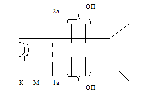 Рассмотрим ее устройство. Катод К представляет собой, как обычно, полый цилиндр, но с одним донышком. Оксидный слой нанесен только на это донышко, которым катод обращен внутри трубки. Далее установлен управляющий электрод или модулятор М, который выполнен в виде цилиндра с донышком, в котором имеется отверстие. На модулятор подается отрицательное напряжение относительно катода, которым отталкиваются к оси трубки электроны, вылетающие из катода под углом. Через отверстие в донышке модулятора походят лишь те электроны, которые находятся на оси. Модулятор также выполняет функции управляющей сетки: с увеличением отрицательного напряжения интенсивность выходящего из отверстия электронного потока уменьшается и при определенном отрицательном напряжении полностью прекращаются. Такое напряжение называется запирающим.