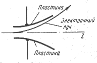 При максимальном угле отклонения луч как-бы скользит по поверхности пластины, не задевая ее. Так как проводящая пластина являются эквипотенциальной поверхностью, ортогональные к ней силовые линии поля всюду направлены перпендикулярно к электронному лучу, т. е. обеспечивается указанное выше максимально возможное отклоняющее действие.