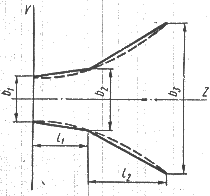 Рис. Однократно-изломанные отклоняющие пластины, близкие к оптимальным (пунктиром)