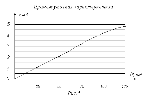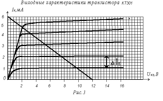На семействе выходных характеристик транзистора КТ301 проводится нагрузочная прямая через точки с координатами (0,6) и (12,0). По точкам пересечения нагрузочной прямой с выходными характеристиками строится промежуточная характеристика iк =F(iб ) (Рис.4). Для этих целей удобно составить Таблицу 1.