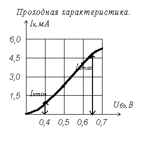 По проходной характеристике определим положение рабочей точки, зададимся значением Uбэ0 =0,525В – это середина линейного участка проходной вольт амперной характеристики (Рис.5).