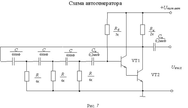 2.2 Расчет автогенератора. RC-генератор выполнен по схеме изображенной на Рис.1, с использованием биполярного транзистора КТ301. Частота генерации fг = 100 кГц. Напряжение питания Uпит авт = 12В.
