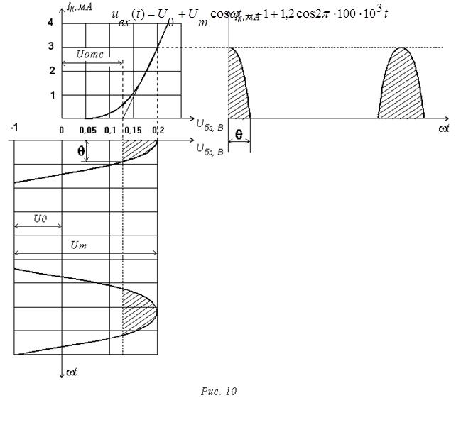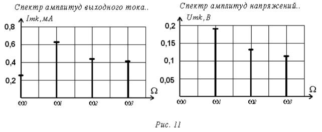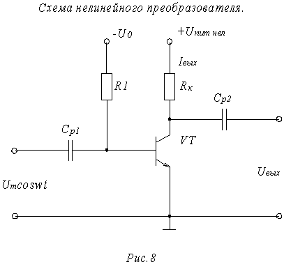 Исходные данные для расчета нелинейного преобразователя: транзистор П27; Uп нел =12В – напряжение питания нелинейного элемента; U0 =-1,0В – напряжение смещения нелинейного элемента; Uм =1,2В – амплитуда напряжения на входе нелинейного преобразователя; схема нелинейного преобразователя – Рис.8; тип нелинейного элемента – транзистор П27; Rк =300 Ом.