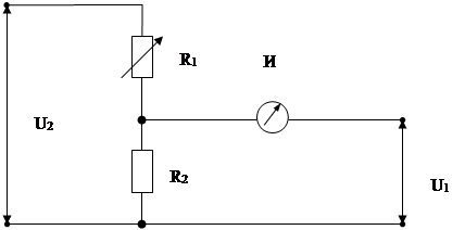 Из формулы (1.2) видно, что отношение сопротивлений при условии баланса является мерой измеряемого отношения напряжений. Следовательно, отградуировав переменное сопротивление соответствующим образом можно определять отношение подаваемых на схему напряжений путём балансировки схемы.