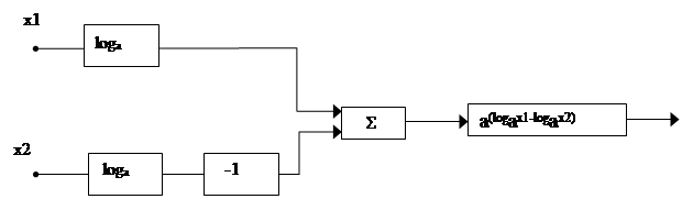Логарифмирование независимых переменных x1 и x2 и последующее вычитание обеспечивают выполнение операции деления в логарифмическом масштабе.