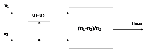 Логарифмические делительные схемы различаются в основном видом логарифмического преобразования, от которого в значительной степени зависят точность, динамический диапазон и сложность логарифмических делительных схем. Структурная схема измерителя отношения основанная на логарифмическом методе представлена на рисунке 1.2.