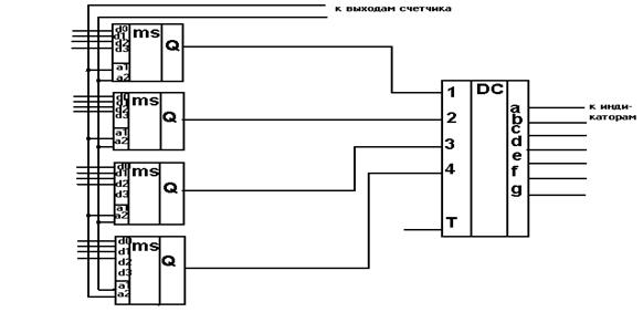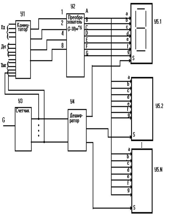 Двоичный счетчик У3 подсчитывает вых. импульсы тактового генератора G.Число индицируемых цифр представлено количеством индикаторовв схеме .(n=4).Число разрядов счетчика равно числу адресных входов мультиплексора, Коэффициент пересчета счетчиков N=n=4