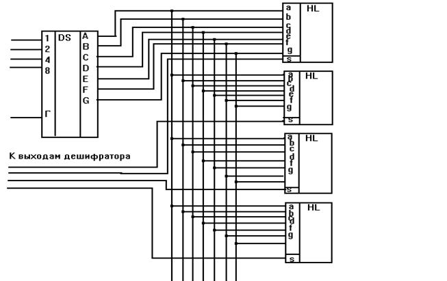 Счетчик Y3 непрерывно подсчитывает входные импульсы, подаваемые от генератора G. Коэффициент пересчета счетчика N=4. Каждое состояние счетчика Y3 дешифрируется дешифратором Y4, подключая соответствующий индикатор. n=4.i=3.Цифра 7