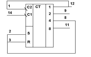 Для обеспечения N=n=4 необходимо, чтобы при появлении на выводе двоичного кода 0111(2) = 7(10) все триггеры счетчика сбрасываются в 0. Для этого необходимо ввести цепи ОС с выходов счетчика, на соответствующие входы. Для данного случая необходимо вывод 8 счетчика соеденить со схемой “сброс” (выводы 2,3). Тогда при появлении на выходе кода 0111 “ еденица “ с выхода 8 сбросит счетчик в исходное состояние.
